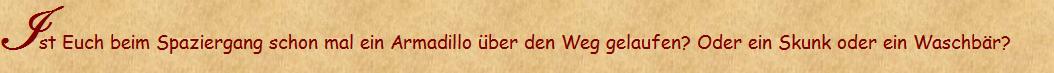 Nicht nur viele Hirsche kamen und grasten rund ums Haus, unter der Terrasse gab´s eine Höhle, die sich als Residenz eines Armadillos (Gürteltier) entpuppte. Der Feigenbaum hinterm Haus war auch sehr beliebt. Nachdem ständig Feigen vom Baum verschwanden, erwischte Heinrich eines Nachts den Dieb. Es war ein Opossum (oder Beutelratte) die gemütlich im Baum saß und sich bei ihrer nächtlichen Mahlzeit nicht stören ließ. Ein Jahr später wurden vier junge Waschbären in dem gleichen Baum erwischt, nachdem sie Heinrich vorher aufgeweckt hatten, indem sie munter auf dem Hausdach rumtanzten.